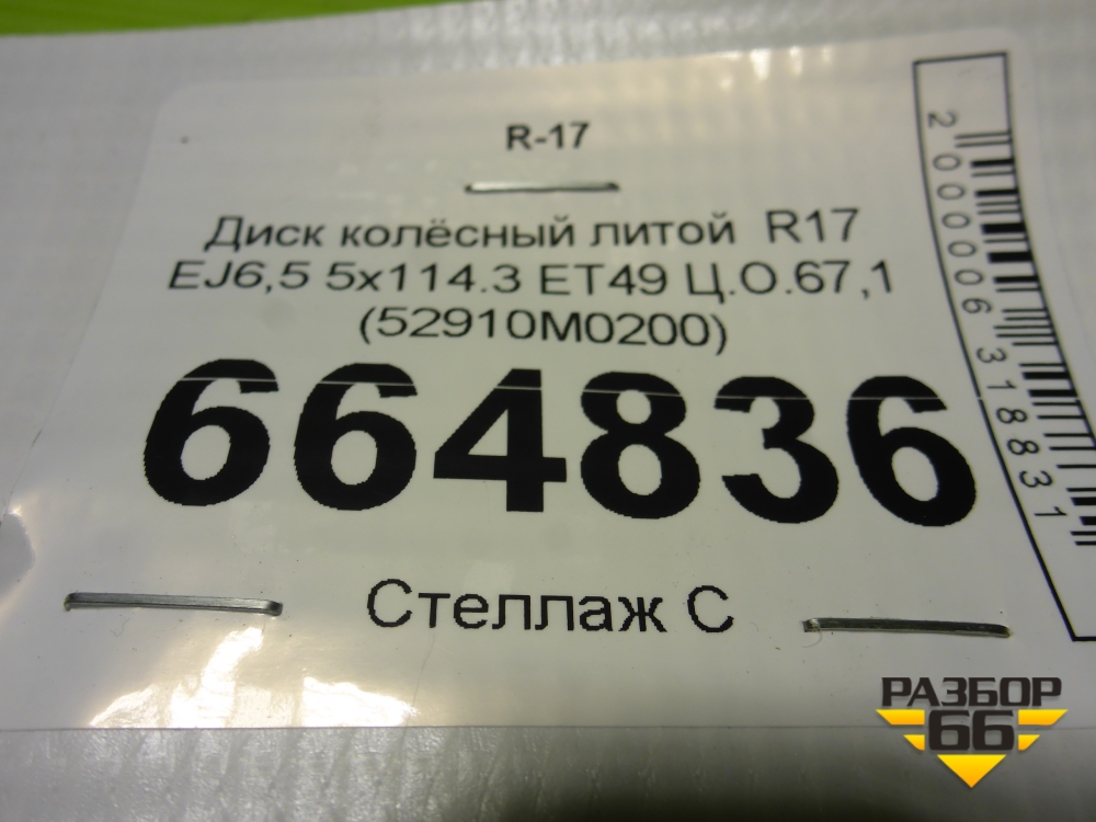 Диск колёсный литой R17 EJ6,5 5x114.3 ET49 Ц.О.67,1 (52910M0200) в Тюмени