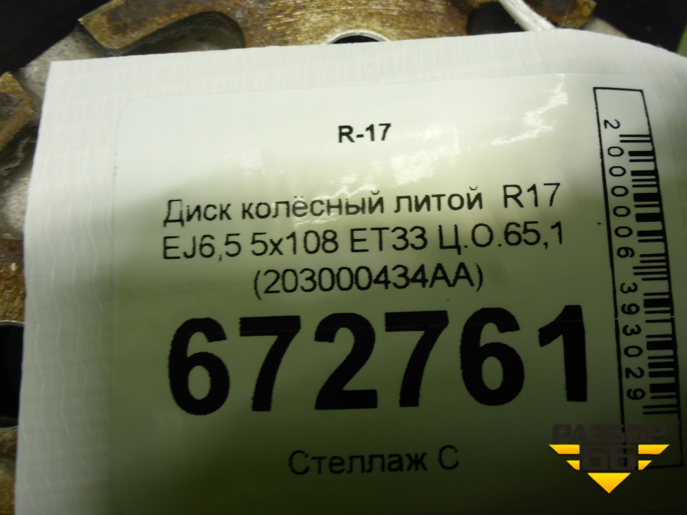 Диск колёсный литой R17 EJ6,5 5x108 ET33 Ц.О.65,1 (203000434AA) в Тюмени