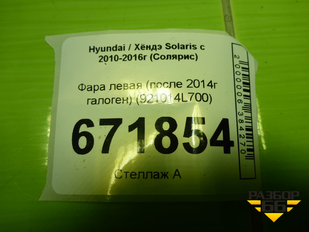 Фара левая (после 2014г галоген) (921014L700) для Hyundai Solaris с 2010-2016г (Солярис) в Тюмени