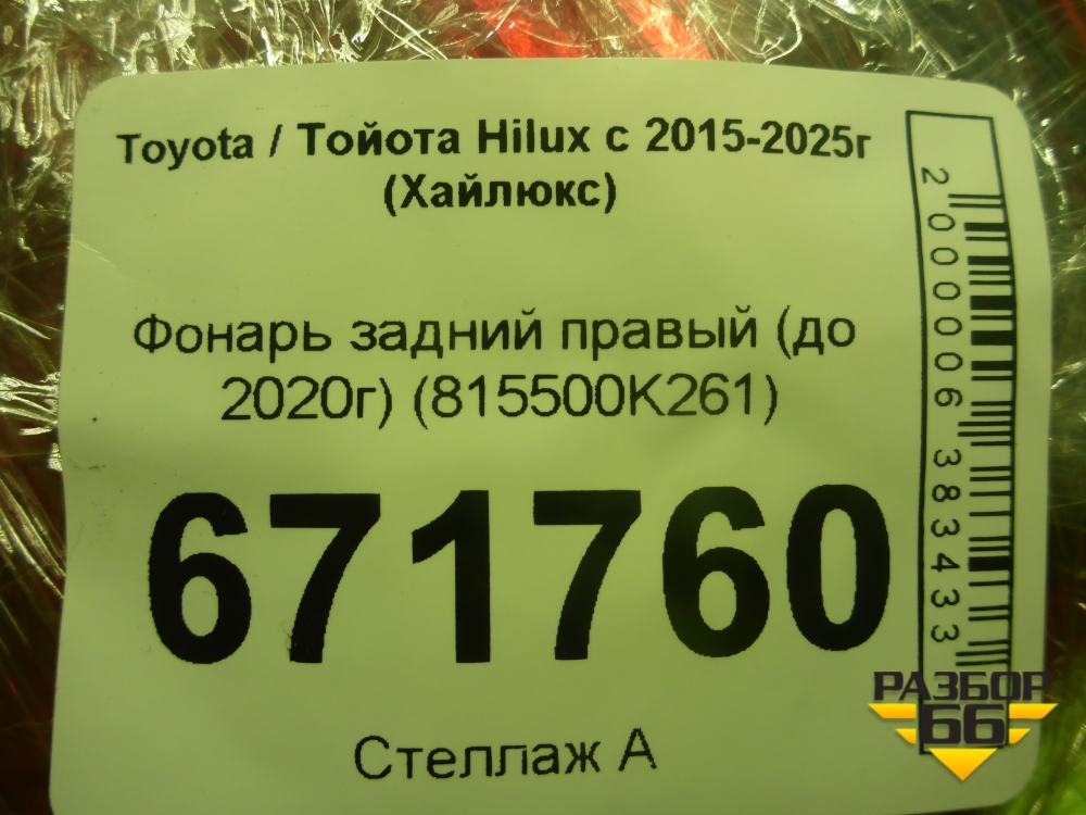 Фонарь задний правый (до 2020г) (815500K261) для Toyota Hilux с 2015-2025г (Хайлюкс) в Тюмени