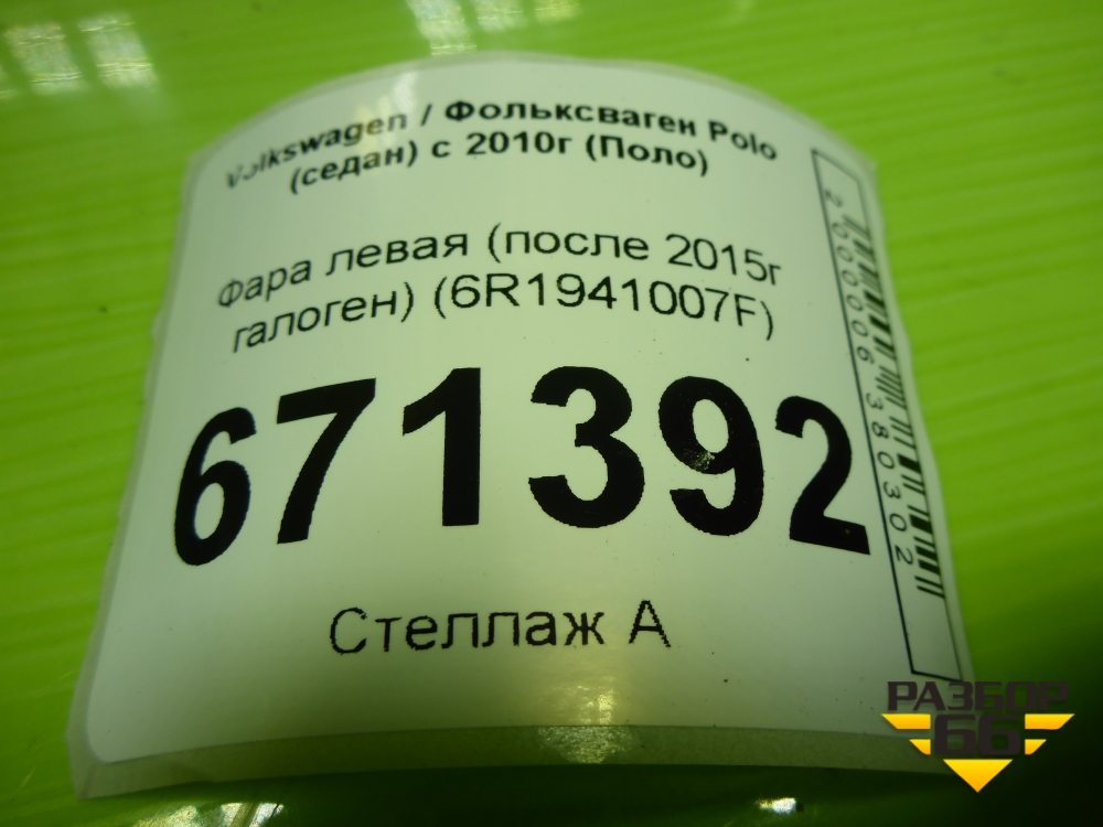 Фара левая (после 2015г галоген) (6R1941007F) для Volkswagen Polo (седан) с 2010г (Поло) в Тюмени