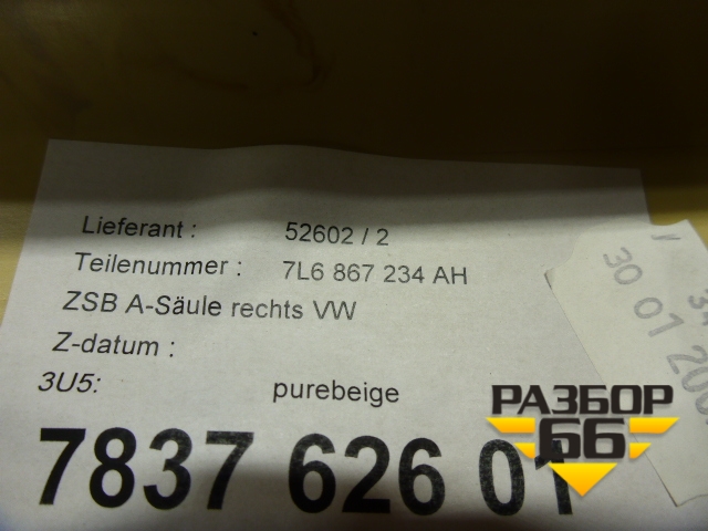 Обшивка стойки лобового стекла правая (бежевая) (7L6867234AH) для Volkswagen Touareg c 2002-2010г (Туарег) в Тюмени